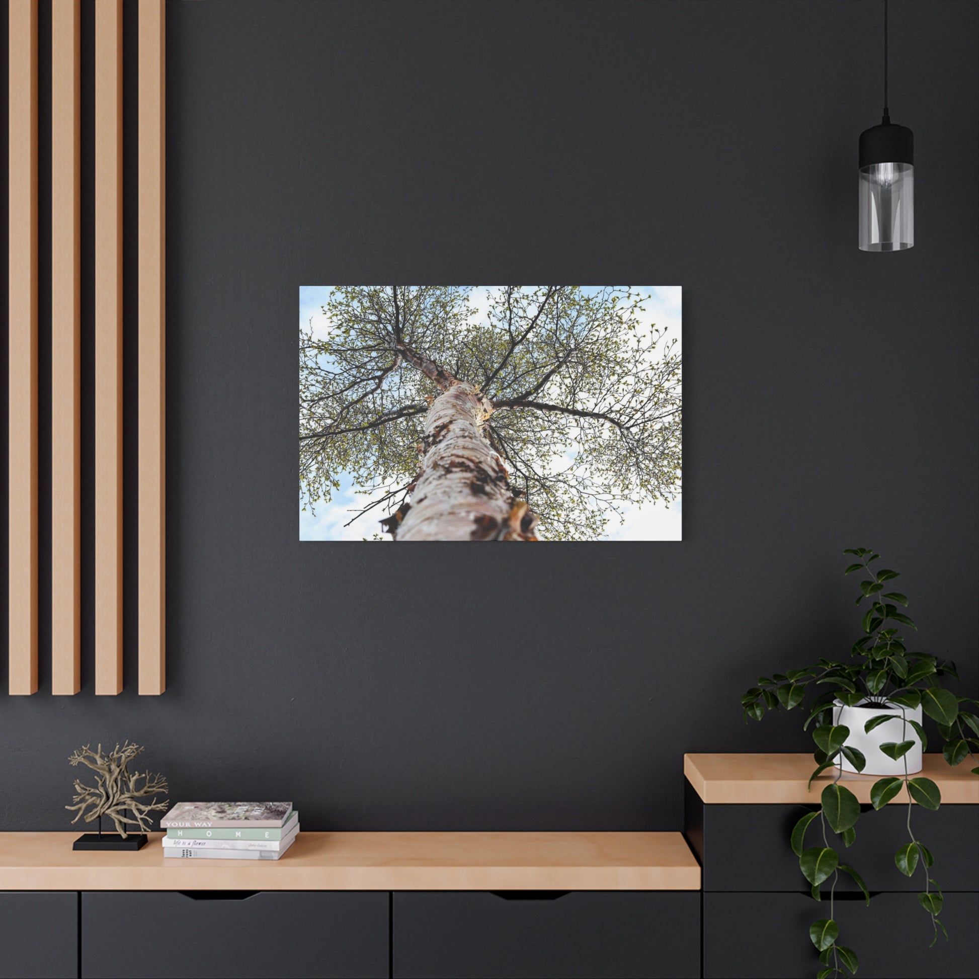 Printed on a matte, stretched canvas with a shallow 1.25" profile, this botanical wall art invites you to look up and breathe. The photograph captures a birch trunk from below, branches fanning out into delicate spring leaves against a pale sky. The muted colors and soft detail create a quiet, restorative presence on your wall ~ like a moment of forest air brought indoors. Hang it above a reading nook, over a mantel, or in an entryway to anchor a natural, calm atmosphere.