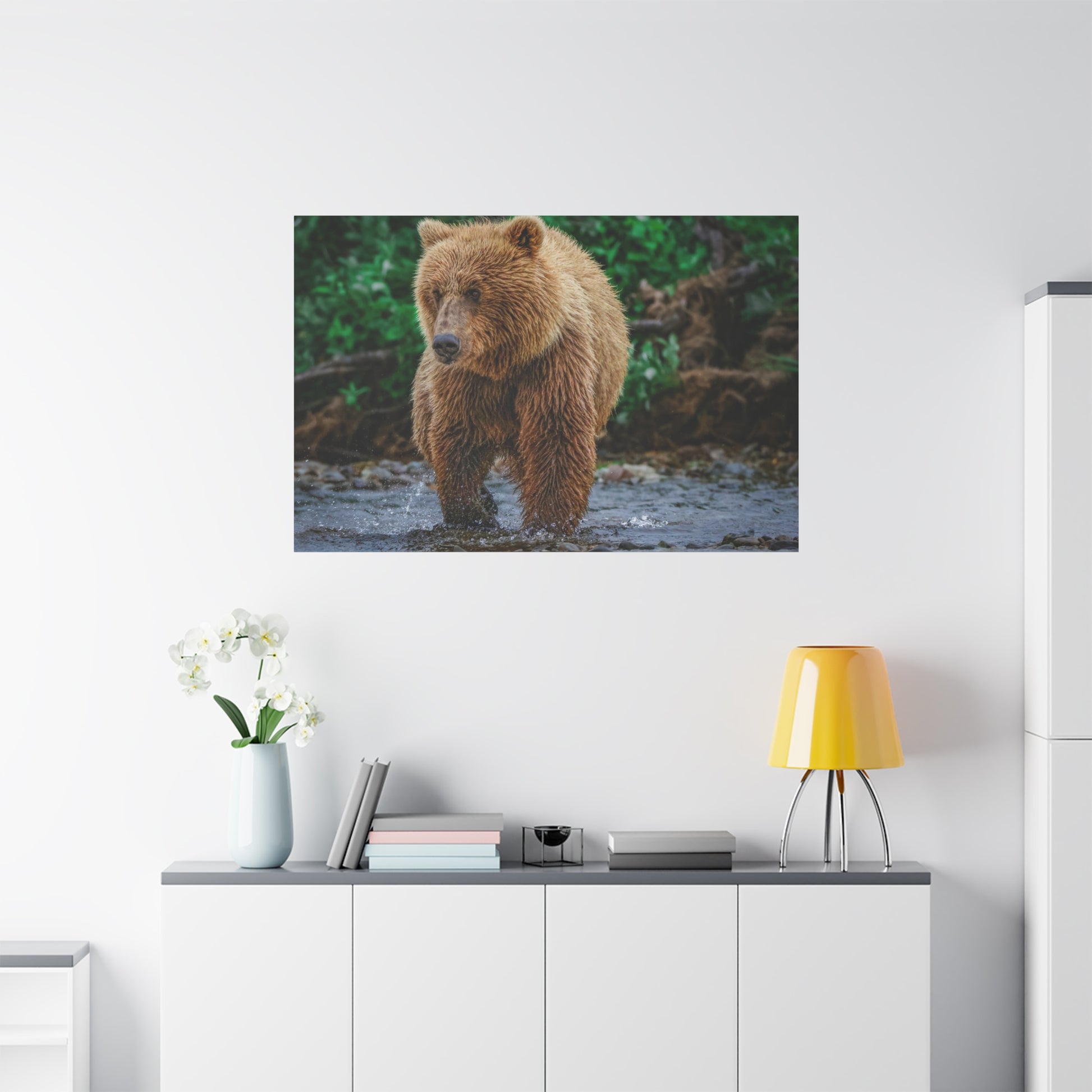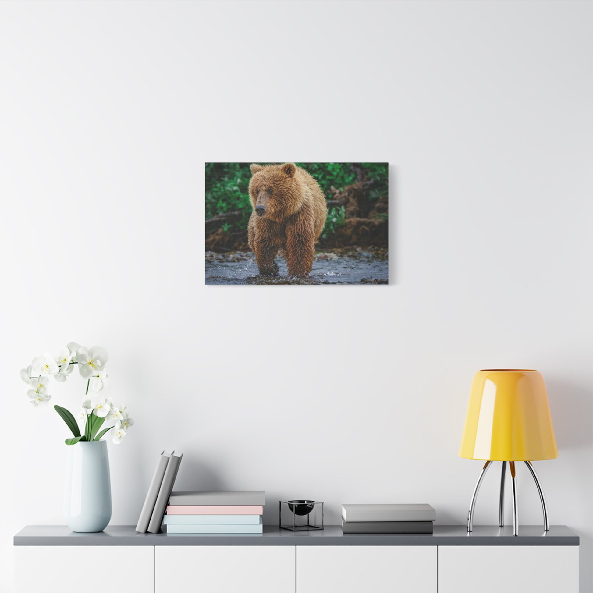 A matte stretched canvas that brings the quiet power of the wild into your home. This gallery-style print captures a close, raw moment with a brown bear moving through a shallow, mossy shoreline. The non-reflective matte finish keeps textures rich and true, while the stretched pine frame gives a clean, floating presence on the wall. Hang it in a living room, study, or cabin to evoke slow mornings by the water, the smell of damp earth, and the steady patience of the forest.