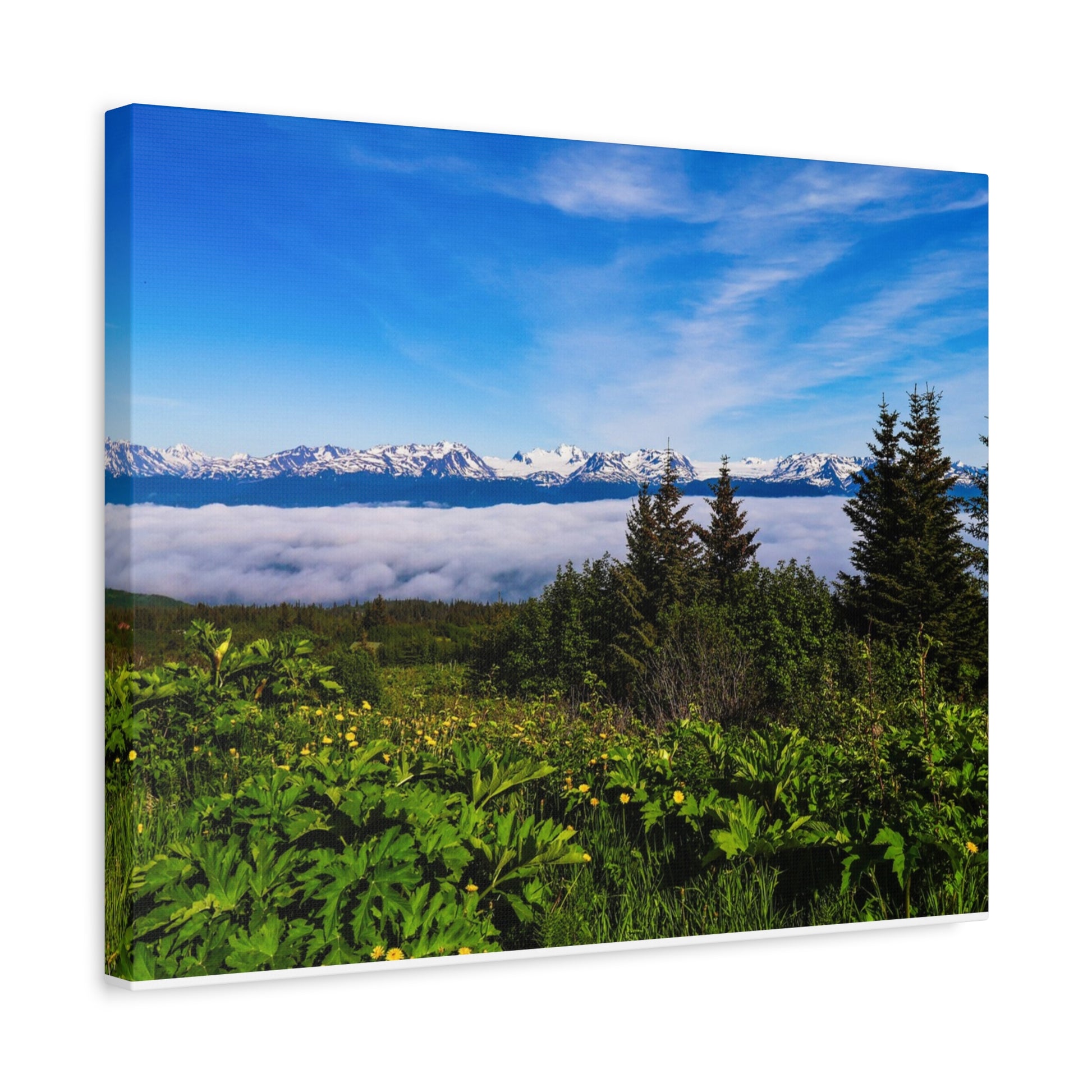 Breathe the mountain air into your room with a matte stretched canvas that quiets the chaos and brings wide-open skies home. Deep blues and soft clouds stretch across a rich matte surface, while verdant foregrounds and distant snow-capped peaks add layered depth. The 1.25" wooden float frame gives a gallery-ready profile that feels both sturdy and understated. Hang it above a sofa, lean it on a mantel, or place it in a reading nook to summon calm mornings, fog lifting over alpine meadows, and the slow exhale of nature.