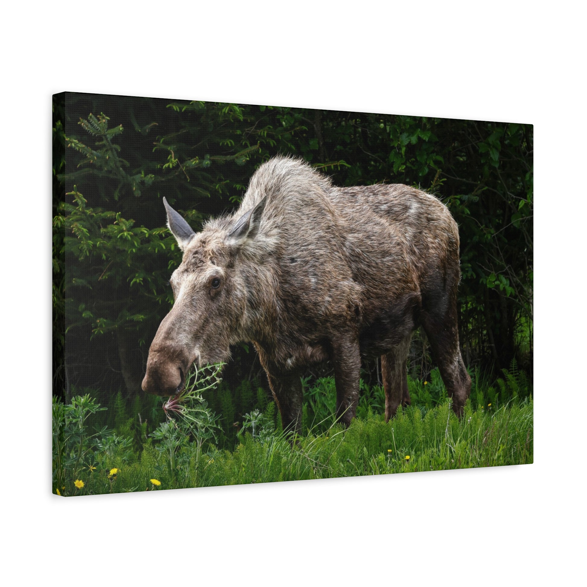 An intimate stretched canvas print that brings a quiet moment from the wild into your home. A lone moose stands at the edge of a dense forest, fur textured and eyes soft with curiosity enjoying a meal of dandelions. The matte surface mutes glare and deepens the greens and earthy browns, giving the scene a contemplative, cabin-in-the-woods feeling. Hung above a mantel or leaned on a shelf, this canvas creates a calm corner where you can pause, remember a backcountry sunrise, or imagine a slow summer walk through the pines. The natural pine stretcher and soft rubber backing keep the piece steady and grounded, like the animal it portrays.