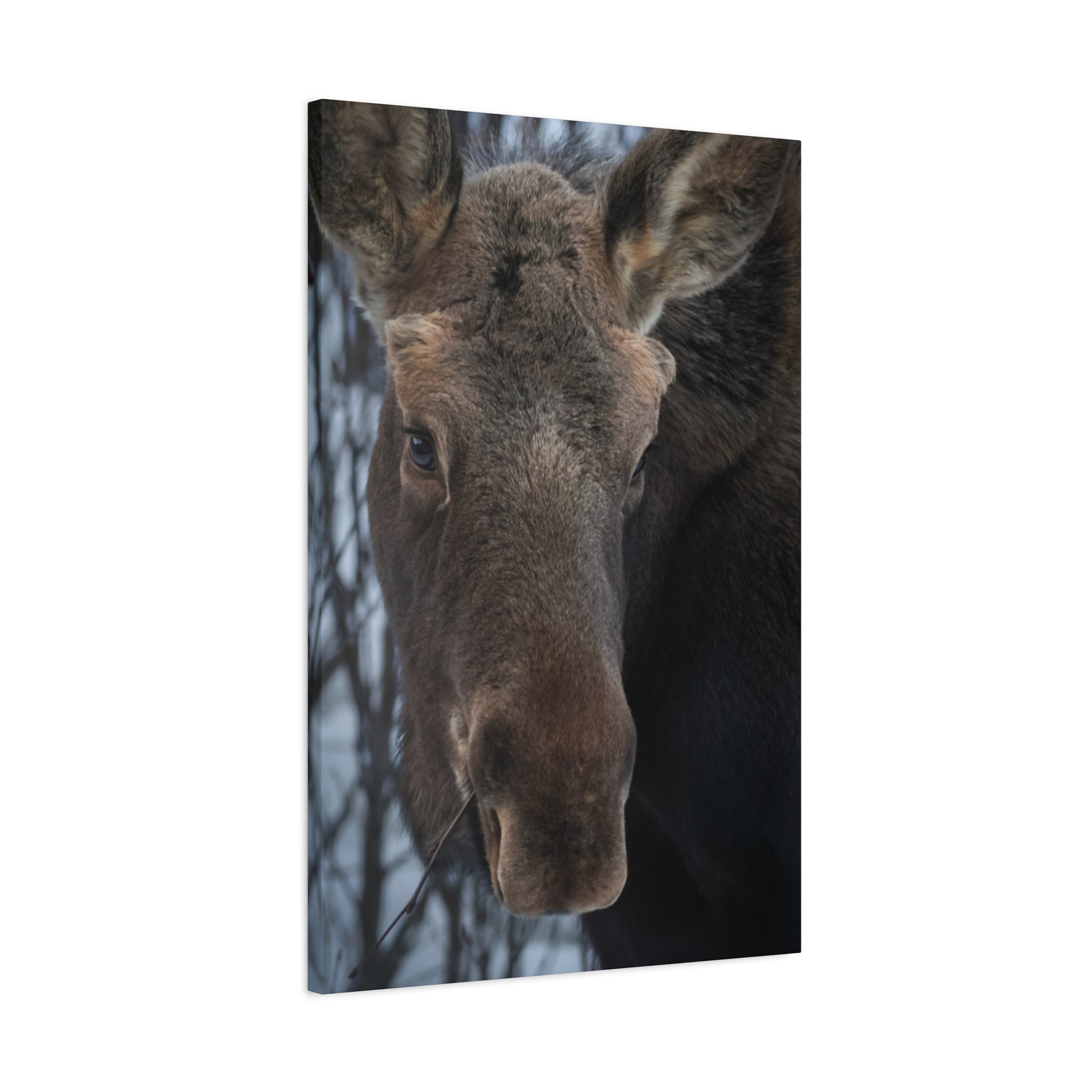 A close-up winter portrait of a moose printed on matte stretched canvas brings quiet northern woods into your room. Hang it above a low bookshelf or beside a frost-streaked window to evoke still, cold mornings when the forest holds its breath. This canvas feels like a warm pause earthy, tactile, and quietly wild meant for people who live for slow nature moments and rustic interiors. The subtle matte finish reduces glare so the moose’s silhouette reads clearly from across the room, while the natural pine frame and soft back supports keep the presentation grounded and simple.